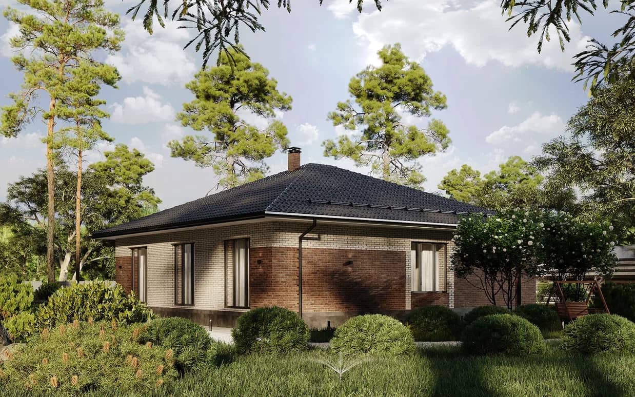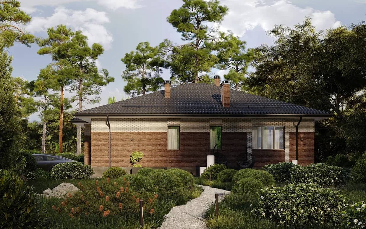 Дом сформирован углом, тем самым образуя приватное пространство внутри строения. Скат кровли увеличен для более комфортного перемещения по террасе.